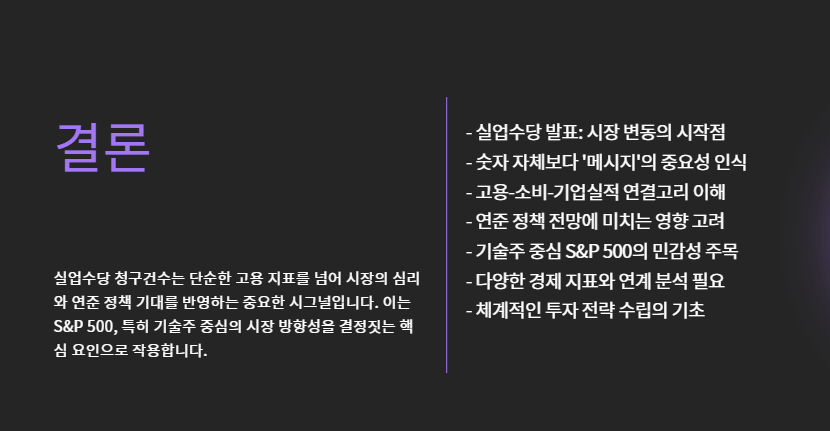 따라서 고용시장 악화 → 소비 둔화 → 기업 실적 감소 → S&P 500 하락이라는 연결고리가 자동으로 작동합니다.