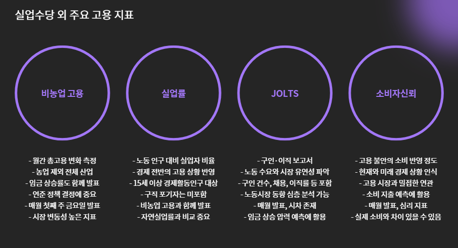 실업수당 청구건수만으로는 전체 고용시장 해석이 어렵기 때문에, 시장은 다음과 같은 지표들도 함께 참조합니다: