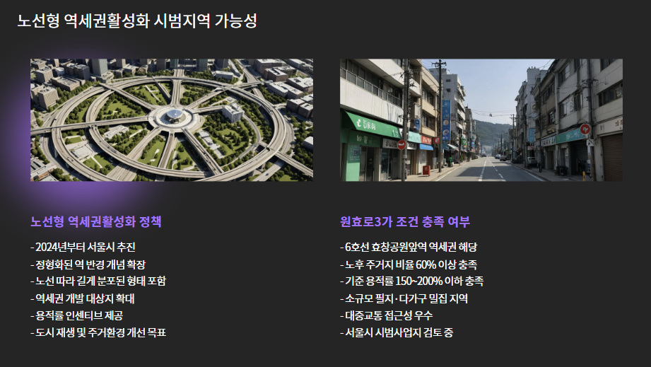 | 정책 수혜 | 역세권 + 노후지 + 노선형 사업지 3박자 |