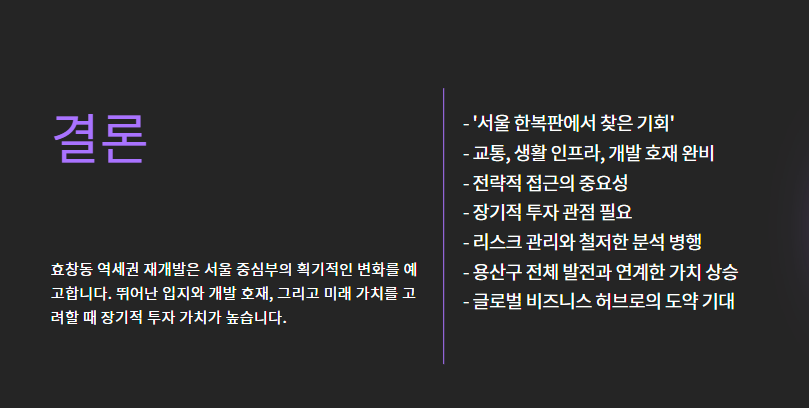 용산 효창동 역세권 재개발은 "서울 한복판에서 찾은 기회"입니다. 교통, 생활 인프라, 개발 호재라는 세 박자를 모두 갖춘 만큼, 전략적 접근이 중요합니다. 단기 차익보다는 장기적인 투자 관점에서 접근한다면 좋은 결과를 기대할 수 있습니다.