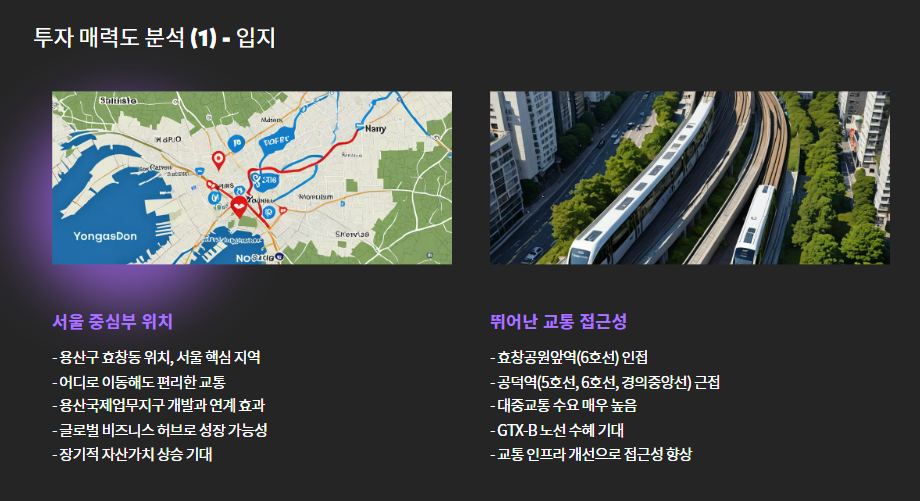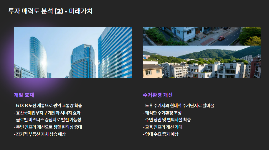 특히 GTX-B 노선과 관련된 개발 호재가 추가로 기대되며, 용산구 전체의 개발 플랜과 맞물려 시너지 효과가 예상됩니다.