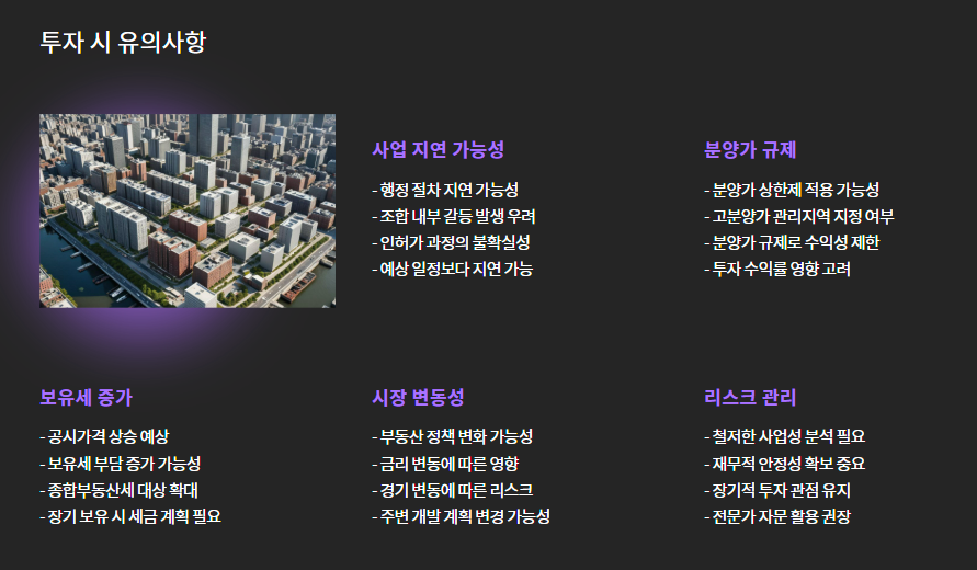 - 사업 지연 가능성: 행정 절차나 조합 내부 갈등으로 일정 지연이 발생할 수 있음