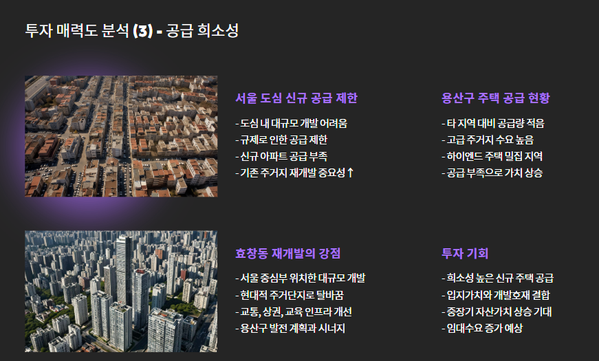 서울 도심 내 신규 아파트 공급은 매우 제한적입니다. 특히 용산구는 전체 주택 공급이 타 지역 대비 낮은 편이기 때문에, 효창동 재개발은 공급 희소성을 무기로 삼을 수 있습니다.