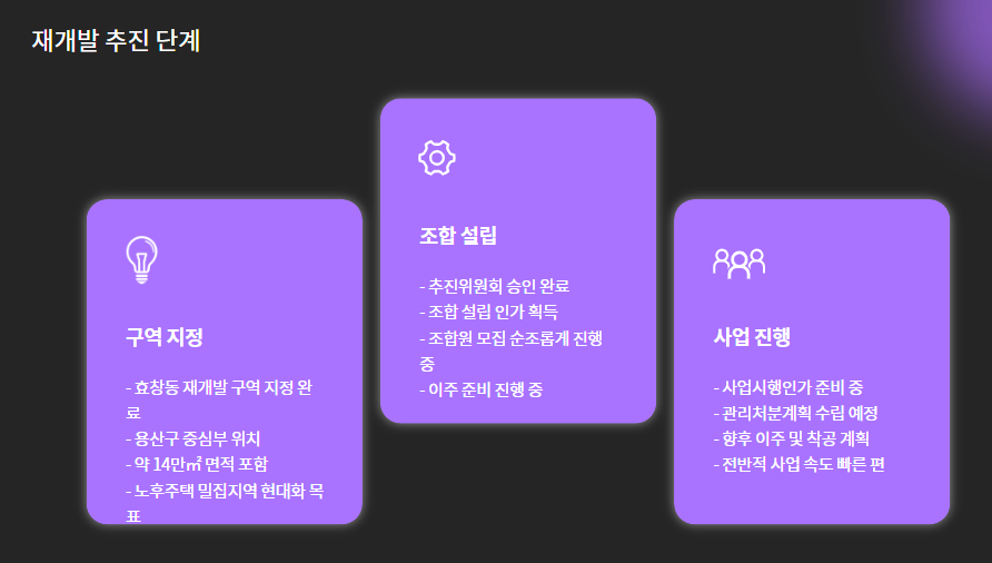 현재 효창동 재개발은 조합 설립인가를 받고 관리처분인가를 준비 중입니다. 조합원 모집과 이주 준비도 순조롭게 진행되고 있어, 사업 속도가 빠른 편에 속합니다.