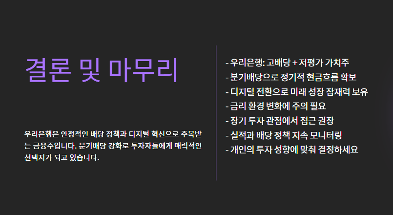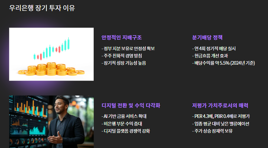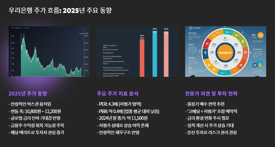 👉 전문가들은 “고배당 + 저평가 조합”을 이유로 우리은행의 중장기 매수 전략을 추천하고 있어요.