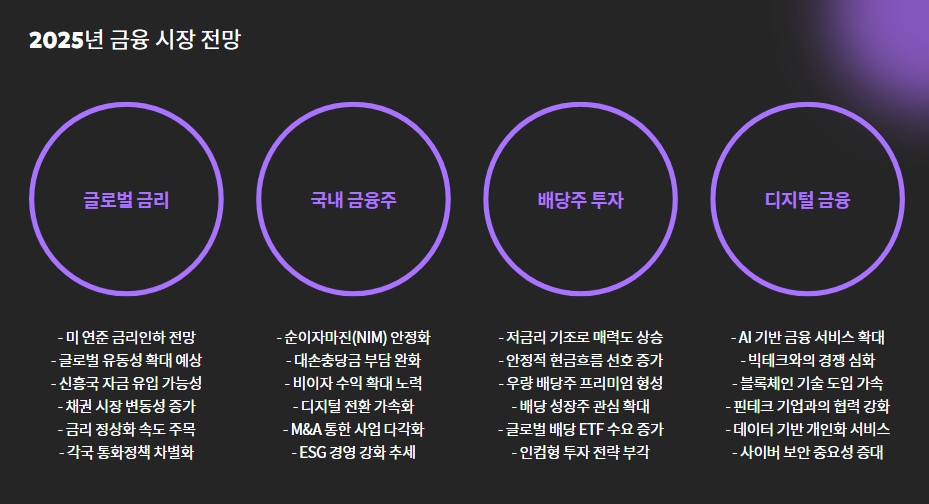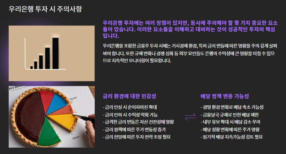 - 금융주는 금리 환경에 민감합니다. 금리 인하 시 순이자마진이 줄어들 수 있어요.