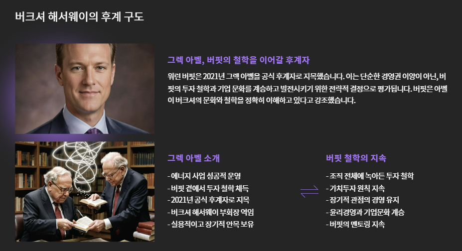 2021년 버핏은 공식적으로 **그렉 아벨(Greg Abel)**을 후계자로 지목했습니다.