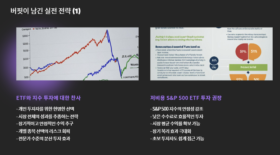 버핏은 수많은 종목 분석가들과 달리, 개인 투자자에게 단순하고 저비용이며 장기적인 지수 투자를 권장해 왔습니다.