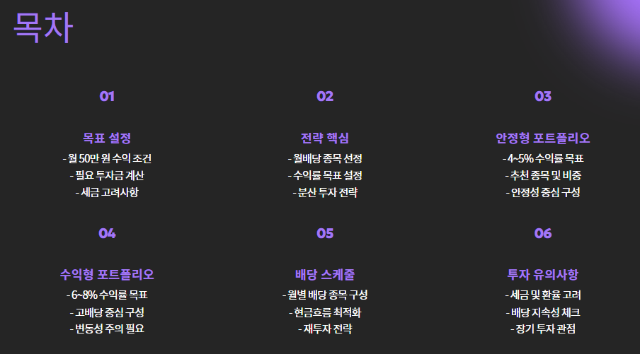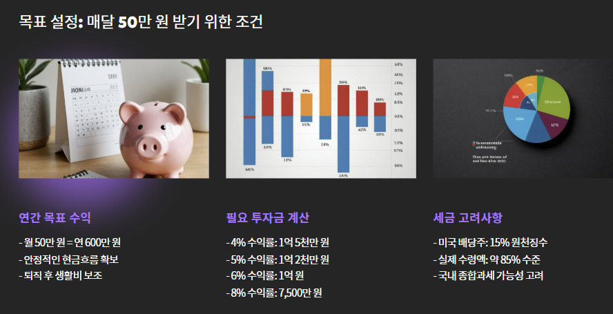 | 목표 | 매달 50만 원 배당 수익 |
