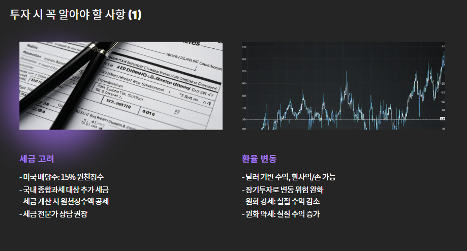 | 주의점 | 세금, 환율, 배당 지속성 |