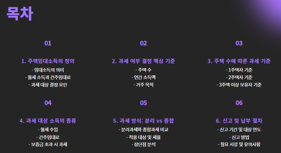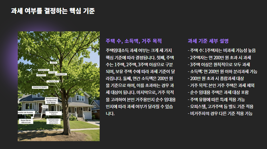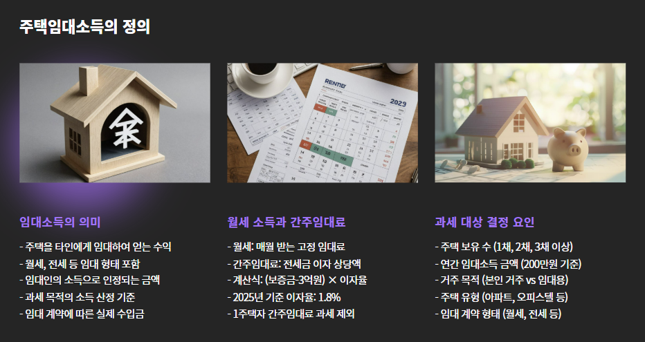 주택임대소득은 크게 월세 소득과 전세보증금에서 발생하는 간주임대료로 나뉘며, 과세 대상 여부는 주택 수와 임대료 수준에 따라 달라집니다.