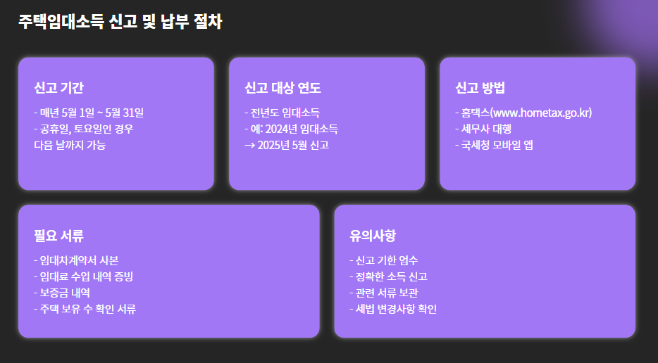 - 신고 대상 연도: 전년도(예: 2024년 임대소득 → 2025년 5월 신고)