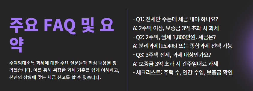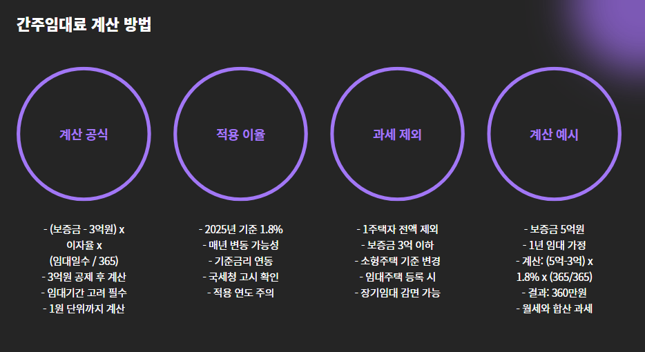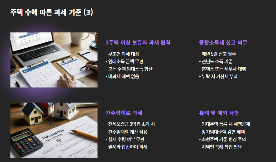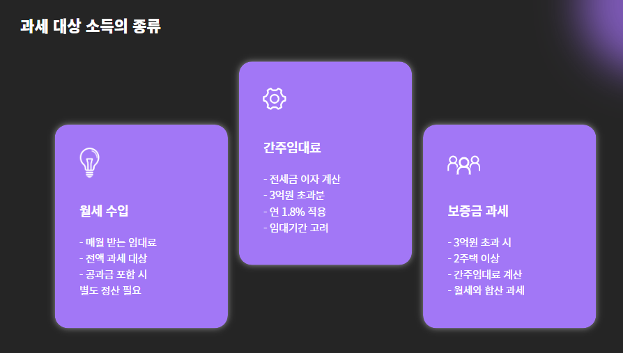 | 보증금 초과 시 | 전세금 총액이 3억원(2주택 이상 보유 기준)을 초과하면 과세 시작 |
