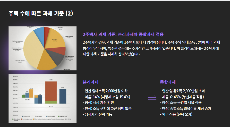 | 적용 대상 | 연 2,000만 원 이하 임대소득 | 연 2,000만 원 초과 임대소득 |