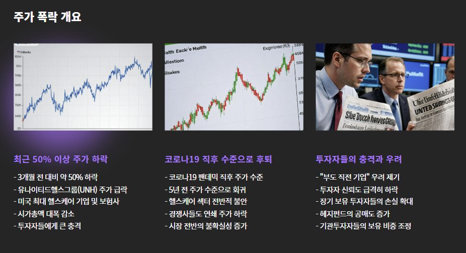 유나이티드헬스그룹의 상황은 단순한 주가 하락이 아니라, 기업 신뢰도와 정책 리스크까지 복합적으로 얽힌 구조다.