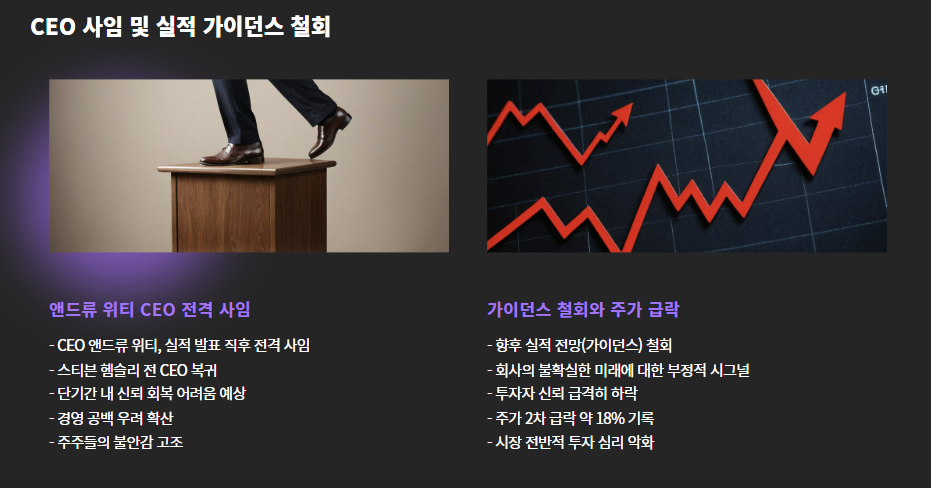 실적 발표 직후 CEO였던 앤드류 위티가 전격 사임했고, 가이던스(향후 실적 전망)도 철회되었다.