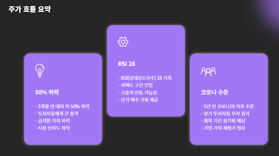 장기적으로는 회복 가능성이 있지만, 단기적인 추가 하락도 배제할 수 없는 구조이기에, 분할 매수 전략 혹은 ETF 분산 투자로 접근하는 것이 현명하다.