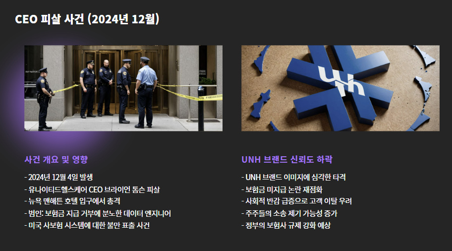 이 사건은 단순 CEO 리스크를 넘어서, UNH라는 브랜드에 대한 신뢰도 하락으로 연결됐다.