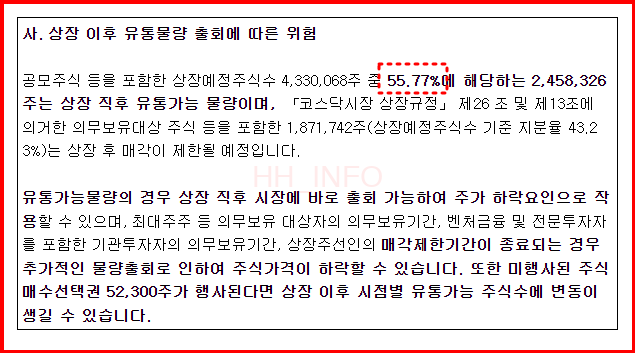 - 높은 유통 가능 물량: 상장 후 유통 가능 주식 수가 약 55.77%로 높아 주가 변동성이 클 수 있음