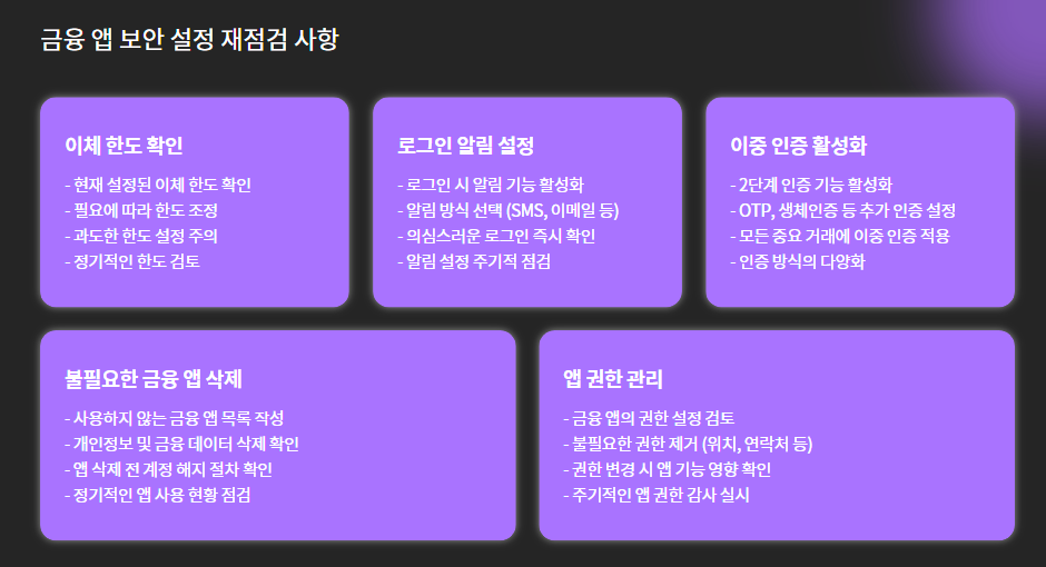 - 이체 한도, 로그인 알림, 이중 인증 활성화 등을 확인하세요.