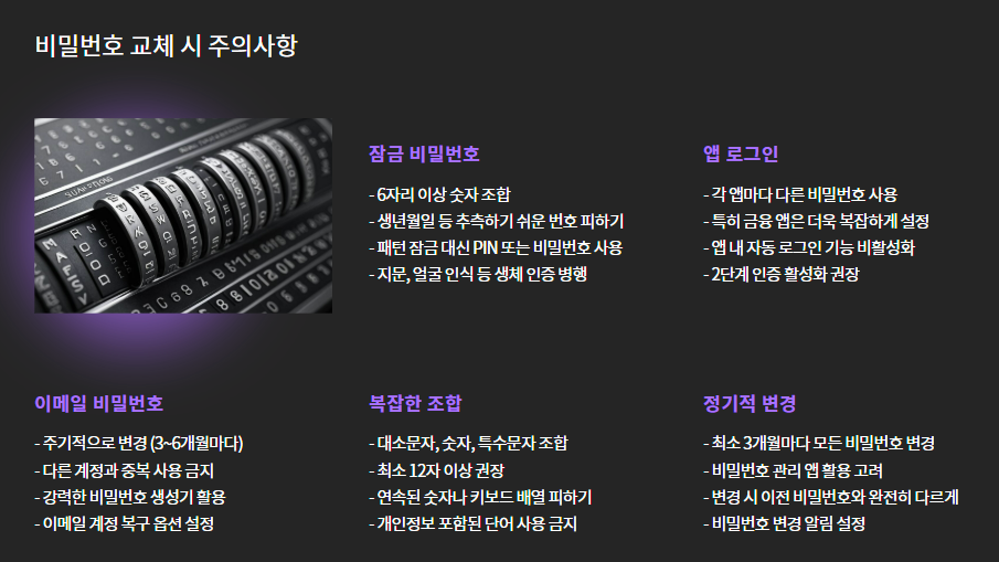 특히 금융 관련 앱은 더욱 복잡한 조합(대소문자, 숫자, 특수문자)으로 변경하는 것이 좋습니다.
