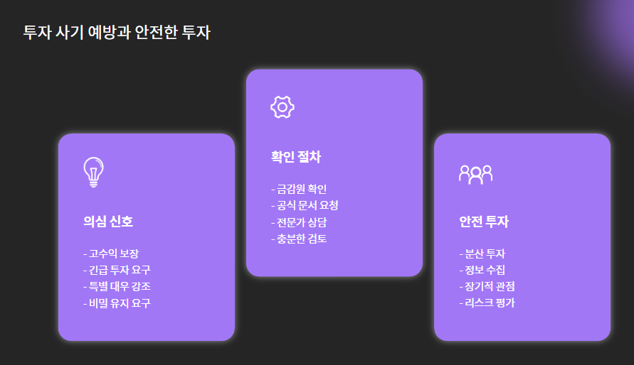 "매달 5% 수익 보장", "절대 손해 안 보는 투자"라는 말은 대부분 허위입니다.