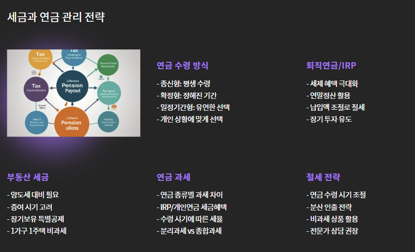 생각보다 많은 분들이 세금과 연금 수령 방식을 간과합니다. 하지만 이 두 가지는 은퇴 후 자산을 지키는 데 있어 매우 중요한 요소입니다.