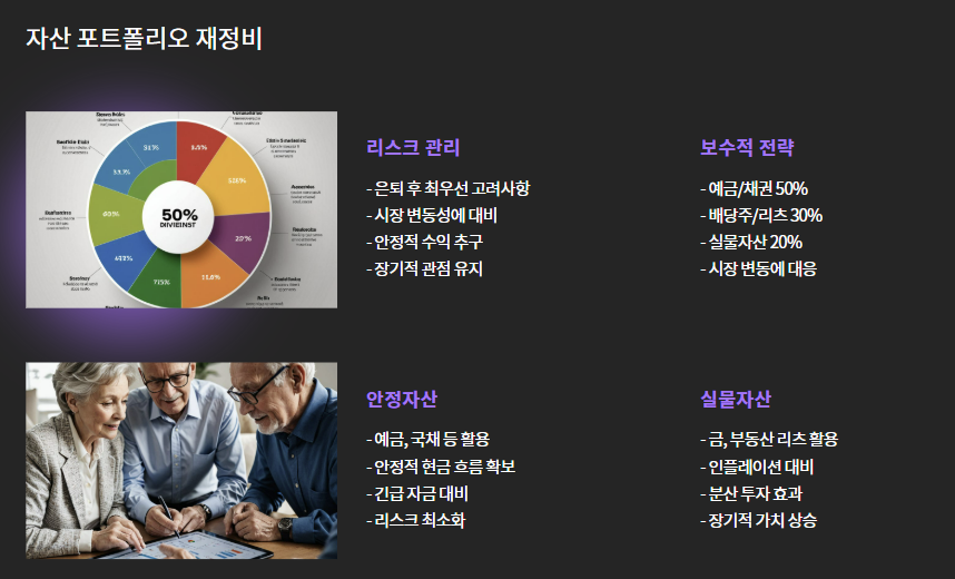 젊을 때와는 달리, 은퇴 이후엔 리스크 관리를 최우선으로 해야 합니다. 따라서 포트폴리오의 구성도 다르게 가져가야 하죠.