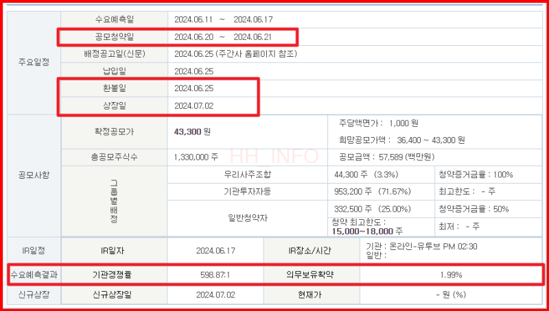 - 일반 청약 한도: 미래에셋 30,000주 (약 6.5억 원), 신한투자 600주 (약 1300만 원)