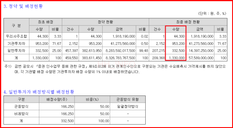 일반투자자 배정 수량: 33만 2500주 (균등/비례 배정 각 16만 6250주)
