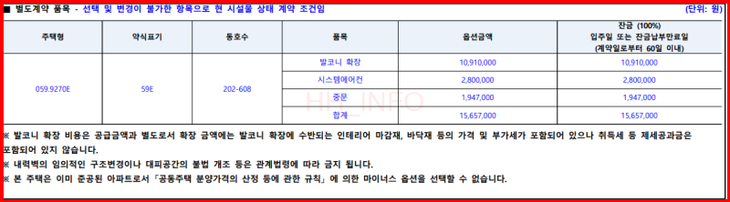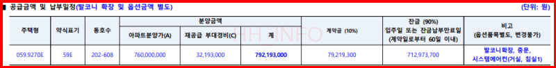 이번에 무순위 청약으로 나온 세대는 202동 608호 59㎡ 타입으로, 분양가 7억 9,219만원에 옵션가 1,565만원을 더해 총 비용은 약 8억 784만원입니다. 계약금은 분양가의 10%인 8,000만원이며, 나머지 7억 2,000만원 가량은 잔금일에 납부하게 됩니다.