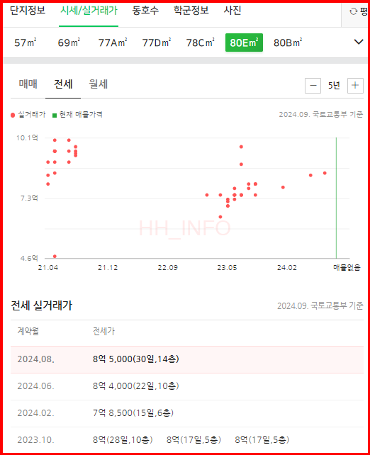 호갱노노에서 확인한 실거래가 내역에 따르면, 같은 타입의 물건은 14억 후반에서 16억원 사이에 거래되고 있습니다. 전세가는 지난 8월 8억 5,000만원에 거래된 이력이 있어, 전세를 활용한 투자도 가능한 상황입니다.