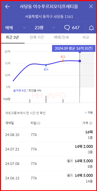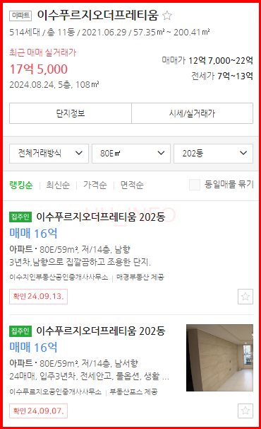 이수푸르지오 더프레티움 59㎡의 현재 시세는 네이버 부동산에 따르면 저층 물건이 16억원에 올라와 있으며, 이는 이번 무순위 청약 분양가인 8억 3,000만원과 비교하면 최소 7억원에서 8억원의 시세차익을 기대할 수 있다는 의미입니다.