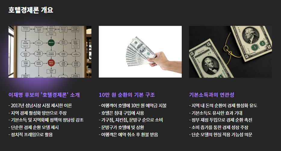 이재명 후보가 과거 시장경제의 예로 든 **‘호텔경제론’**이 최근 다시 주목받고 있습니다.