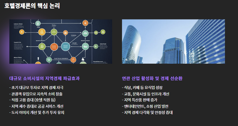 이 말은 즉, 하나의 대규모 소비시설이 지역경제에 연쇄적으로 긍정적인 파급효과를 낳는다는 논리죠. 이걸 ‘호텔’을 중심으로 설명하면서 “호텔경제론”이란 별명이 붙은 겁니다.