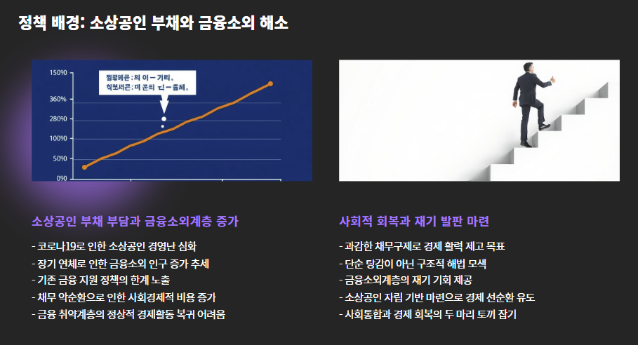 최근 소상공인 부채 부담과 금융소외계층 증가가 민생 불안 요인으로 떠오르면서, 정부는 사회적 회복과 재기의 발판을 마련하기 위해 과감한 채무구제에 나섰습니다.