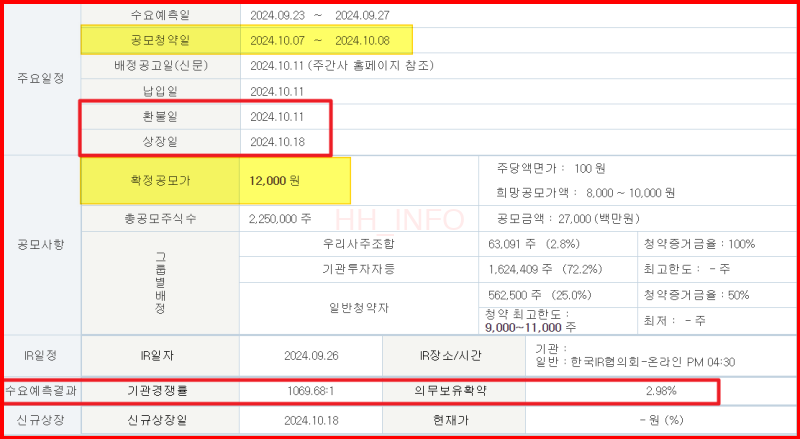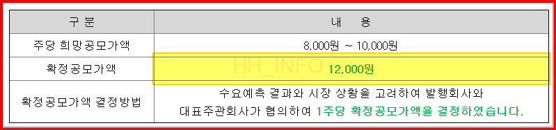 - 공모가: 12,000원으로 상단 가격을 초과하여 결정되었으며, 요즘 공모주 시장 상황에 비춰볼 때 약간 높은 수준입니다.