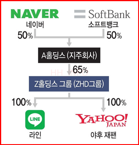 라인은 Z홀딩스의 100% 자회사로, 일본 증시에 상장되어 있습니다. A홀딩스가 Z홀딩스의 지분 약 65%를 보유하고 있으며, 네이버와 소프트뱅크가 A홀딩스의 지분을 50%씩 나눠가지고 있습니다. 네이버는 초기에 51%의 지분을 보유했으나 이미지 확립을 위해 소프트뱅크와 지분을 나눴습니다.