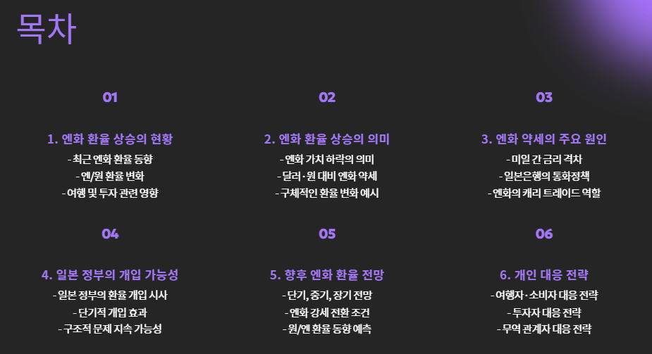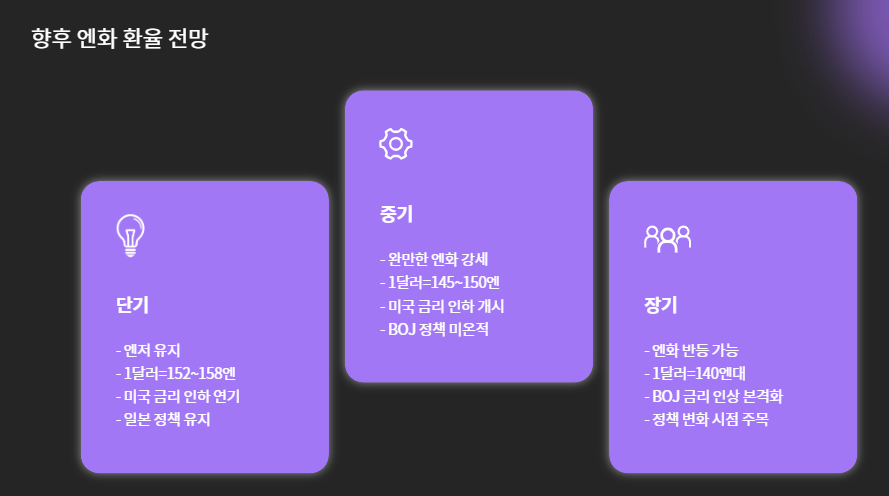 | 단기 (1~3개월) | 미국 금리 인하 연기 + 일본 정책 유지 | 엔저 유지 (1달러 = 152~158엔) |
