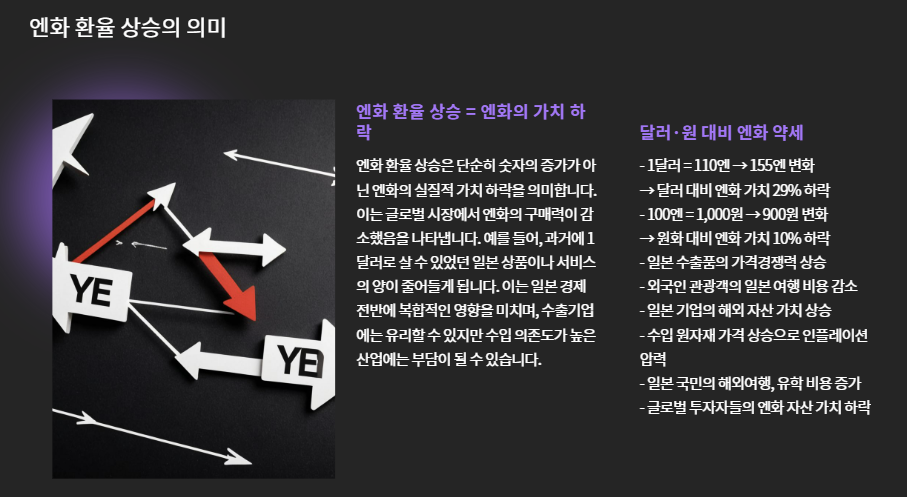 - 엔화 환율 상승 = 엔화의 가치 하락 / 달러·원 대비 약세