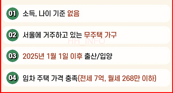 서울시 출산지원금은 누구에게 지원되는 것일까요? 서울에 거주 중이고 주택을 소유하지 않은 가구들이 그 대상입니다. 또한, 주민등록상 주소가 동일한 부부 또는 모이어야 하며, 전세 7억 원 이하이거나 월세 268만 원 이하의 주택에 거주하는 조건이 필요합니다.