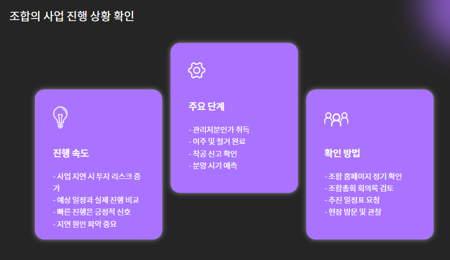 조합총회 회의록이나 추진 일정표를 요청해서 직접 확인하는 것도 방법입니다.
