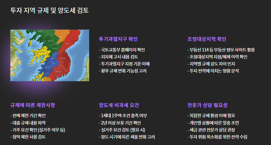 - 규제지역은 전매 제한, 대출 규제, 거주 요건 등이 추가로 적용됩니다.