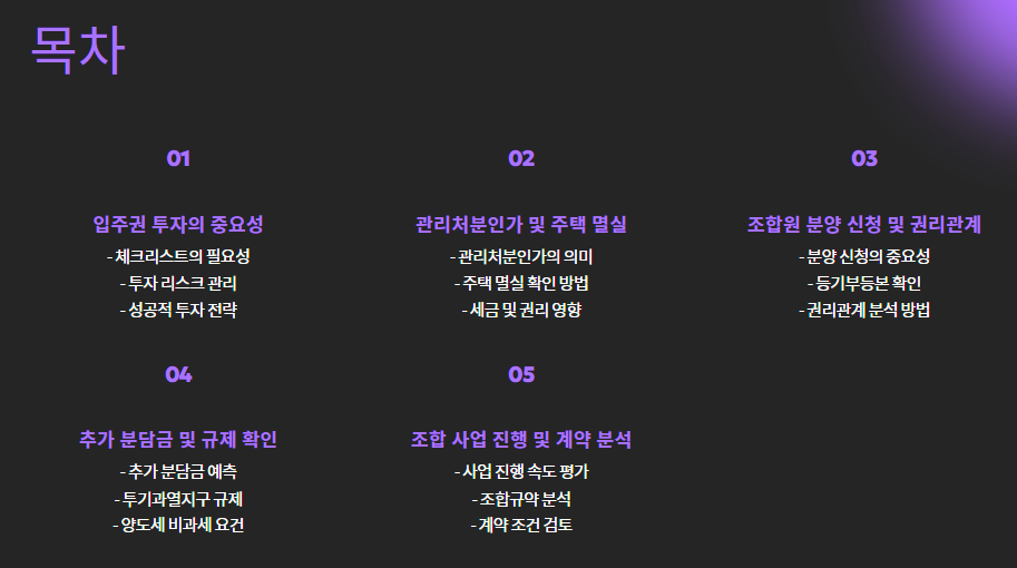 - 관리처분인가, 착공신고, 분양시기 등을 꼼꼼히 체크하세요.