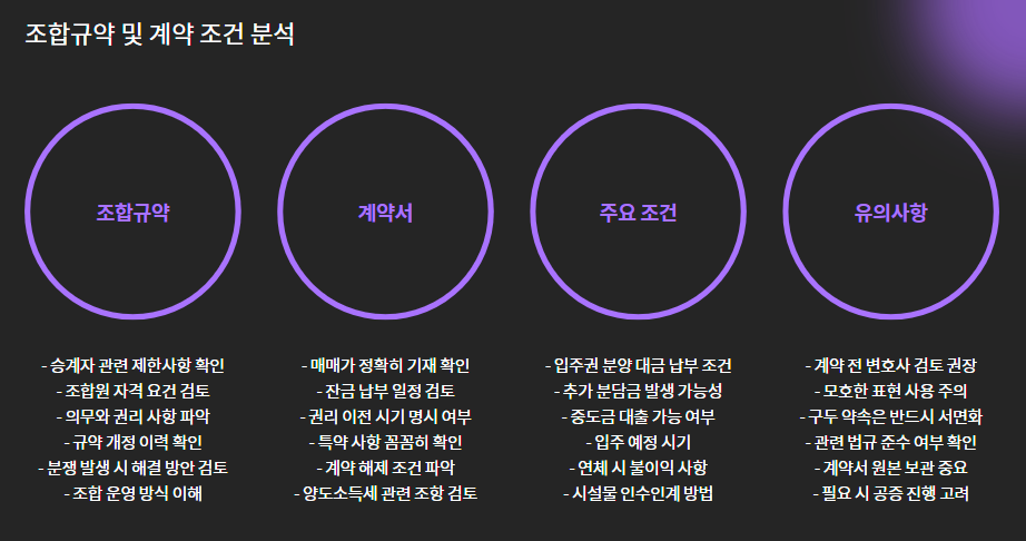 - 조합규약에 승계자(매수자) 관련 제한사항이 있는지 확인해야 합니다.