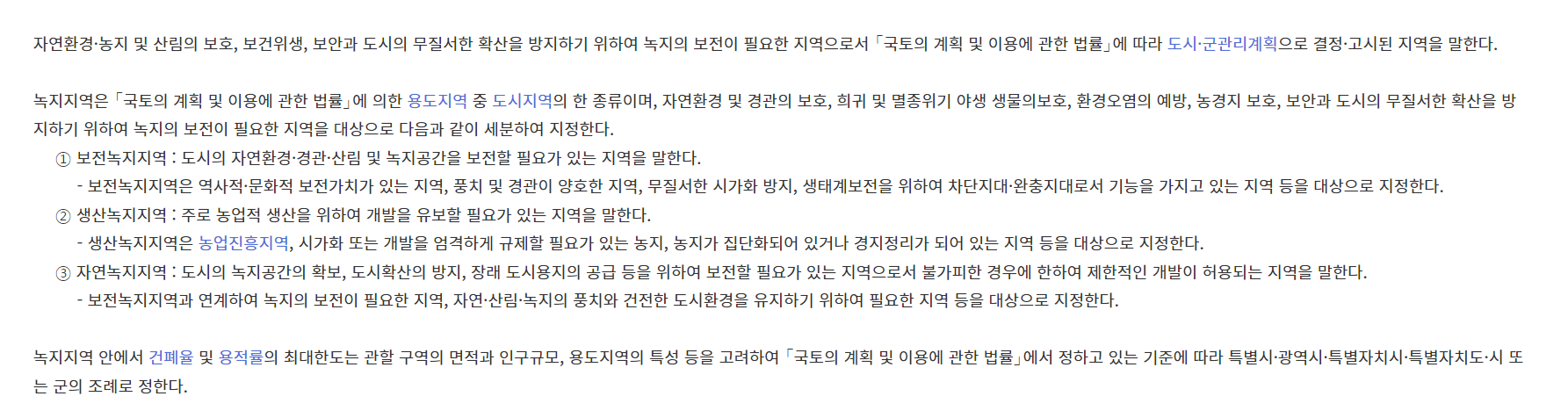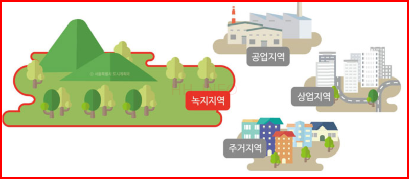 - 녹지지역: 자연환경 보호와 도시 무질서한 팽창을 방지하기 위해 설정된 지역으로, 보전녹지지역, 생산녹지지역, 자연녹지지역으로 세분화됩니다.