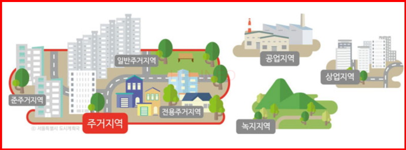 - 주거지역: 전용주거지역과 일반주거지역으로 구분되며, 거주와 관련된 시설들이 주로 들어서며, 건폐율과 용적률 등의 제한이 있습니다.