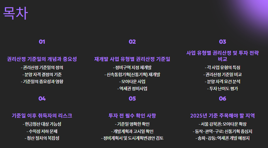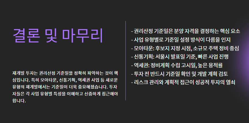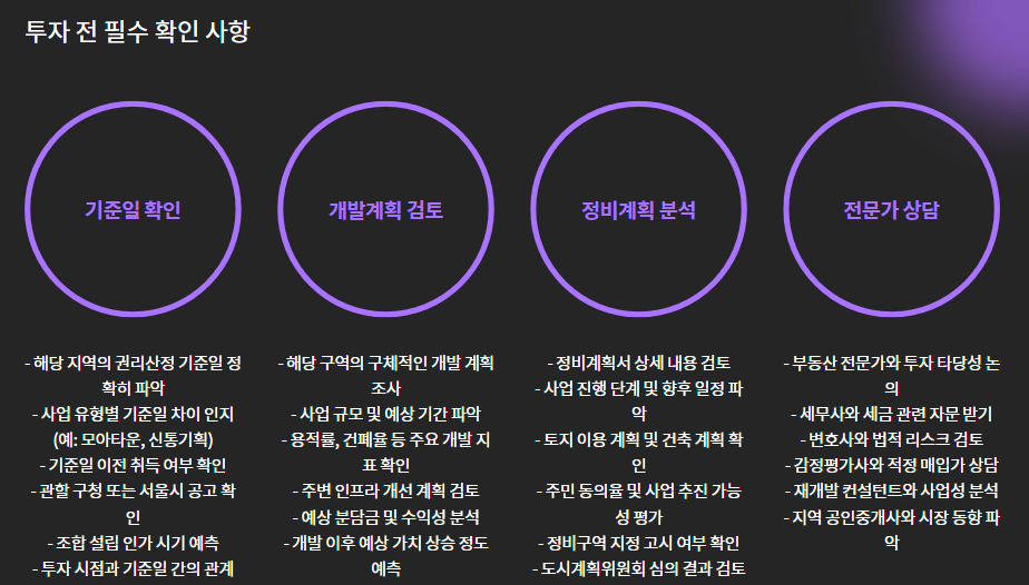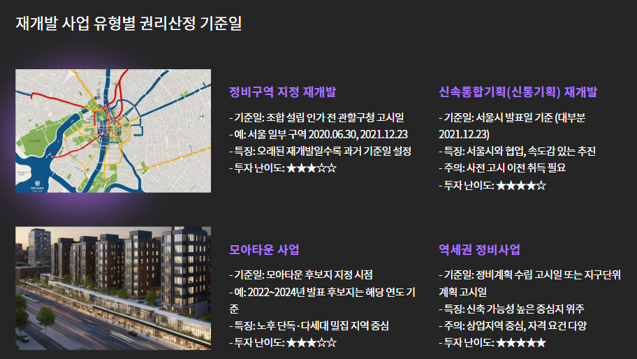 특히 모아타운, 신통기획, 역세권 사업처럼 최근 이슈되는 사업 유형일수록 기준일이 명확히 정해져 있기 때문에,