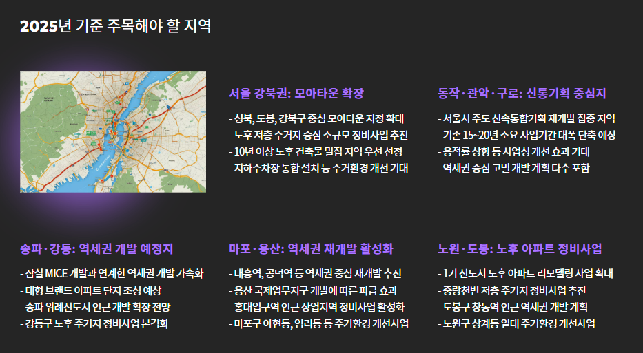 - 서울 강북권: 모아타운 지정지 확장 중 (성북·도봉·강북)