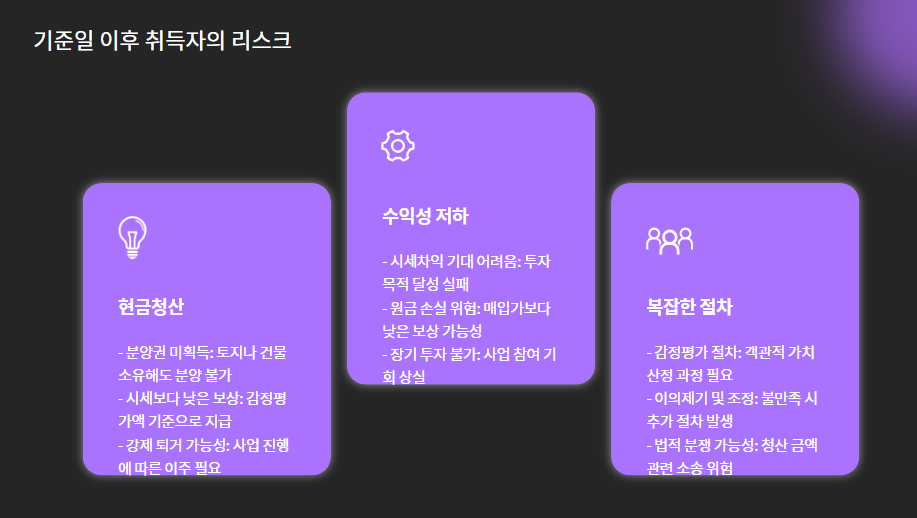 - 청산 절차 복잡: 감정평가액 기준 지급, 실제 시세 반영 어려움